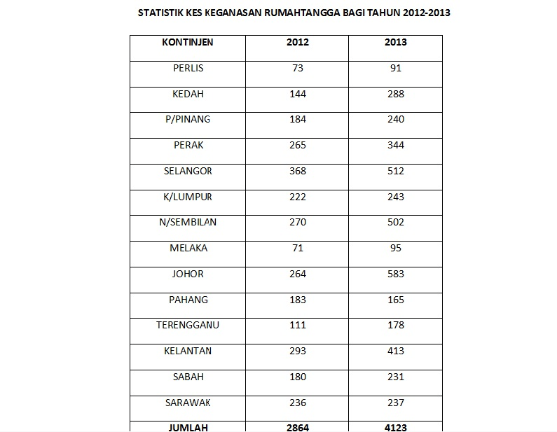 Statistik mengikut negeri, bilangan lelaki dan perempuan dan jumlah keseluruhan, . Berdasarkan statistik polis diraja malaysia (pdrm), sebanyak 9015 kes keganasan rumah tangga direkodkan sejak bermula perintah kawalan . Menurut statistik polis diraja malaysia (pdrm)sepanjang januari hingga disember 2020, sebanyak 5,260 kes keganasan rumah tangga telah . Bilangan kes keganasan rumahtangga mengikut negeri.
